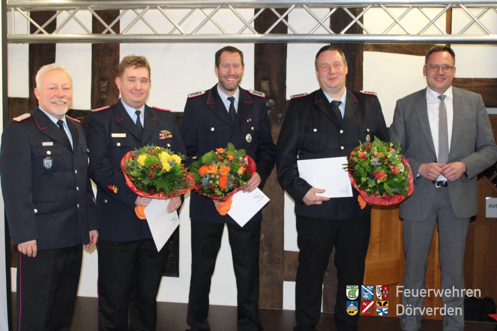 Bürgermeister Alexander von Seggern nahm die Ernennungen und die Verabschiedung im Anschluss an die Beschlussfassung vor. Beide ernannten Funktionsträger legten daraufhin den beamtenrechtlichen Diensteid ab. Anschließend überreichte der Bürgermeister den drei Feuerwehrkameraden im Beisein des Gemeindebrandmeisters Andreas Thölke einen Blumenstrauß.