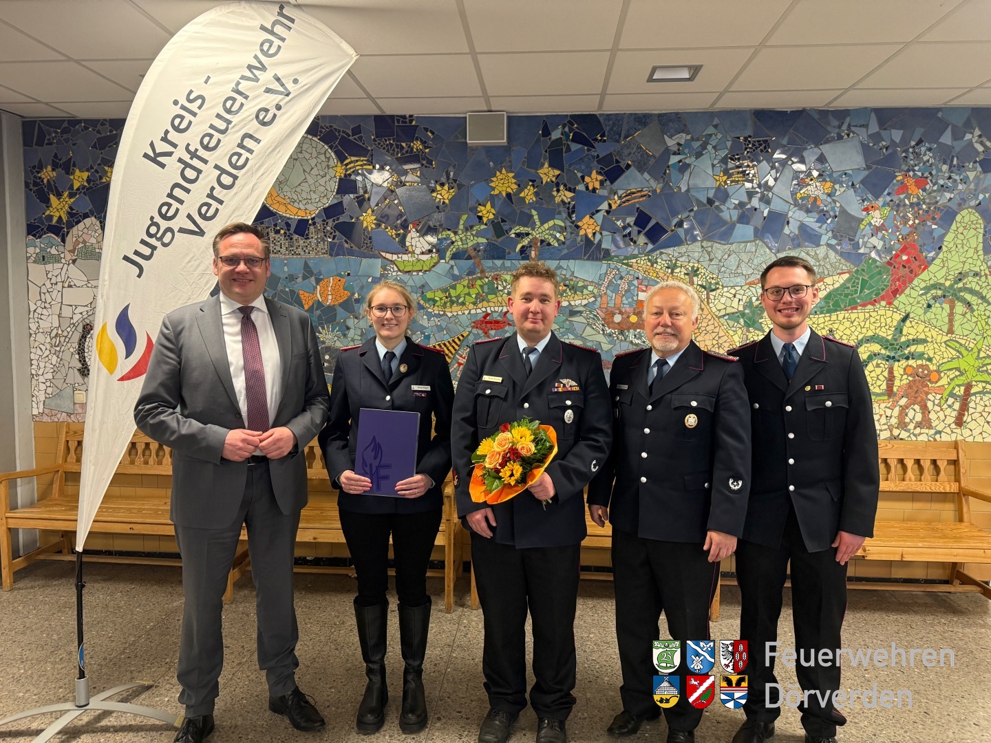 Eine große Überraschung erlebte Aliessa Wigger aus der Ortsfeuerwehr Stedorf. Sie wurde in dankbarer Anerkennung, für Ihren Verdienst und die Hilfe beim Aufbau und der Förderung der Kinder- und Jugendfeuerwehr im Landesfeuerwehrverband Niedersachsen, mit dem Ehrenzeichen der Niedersächsischen Kinder- und Jugendfeuerwehr ausgezeichnet.