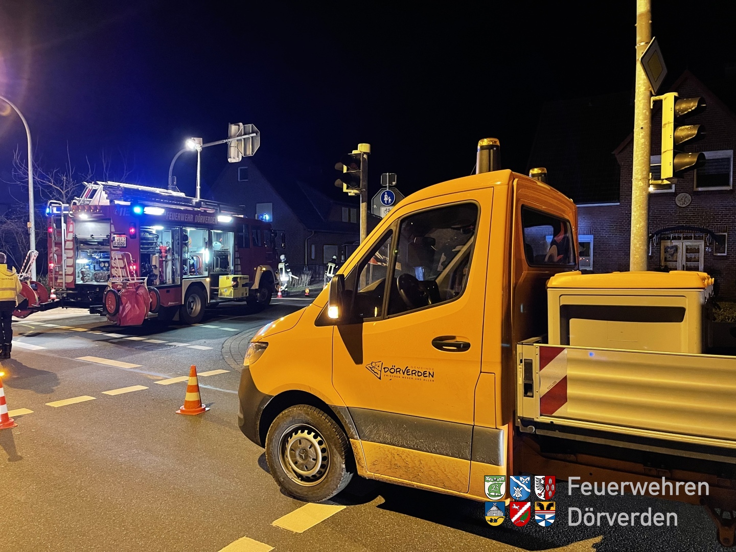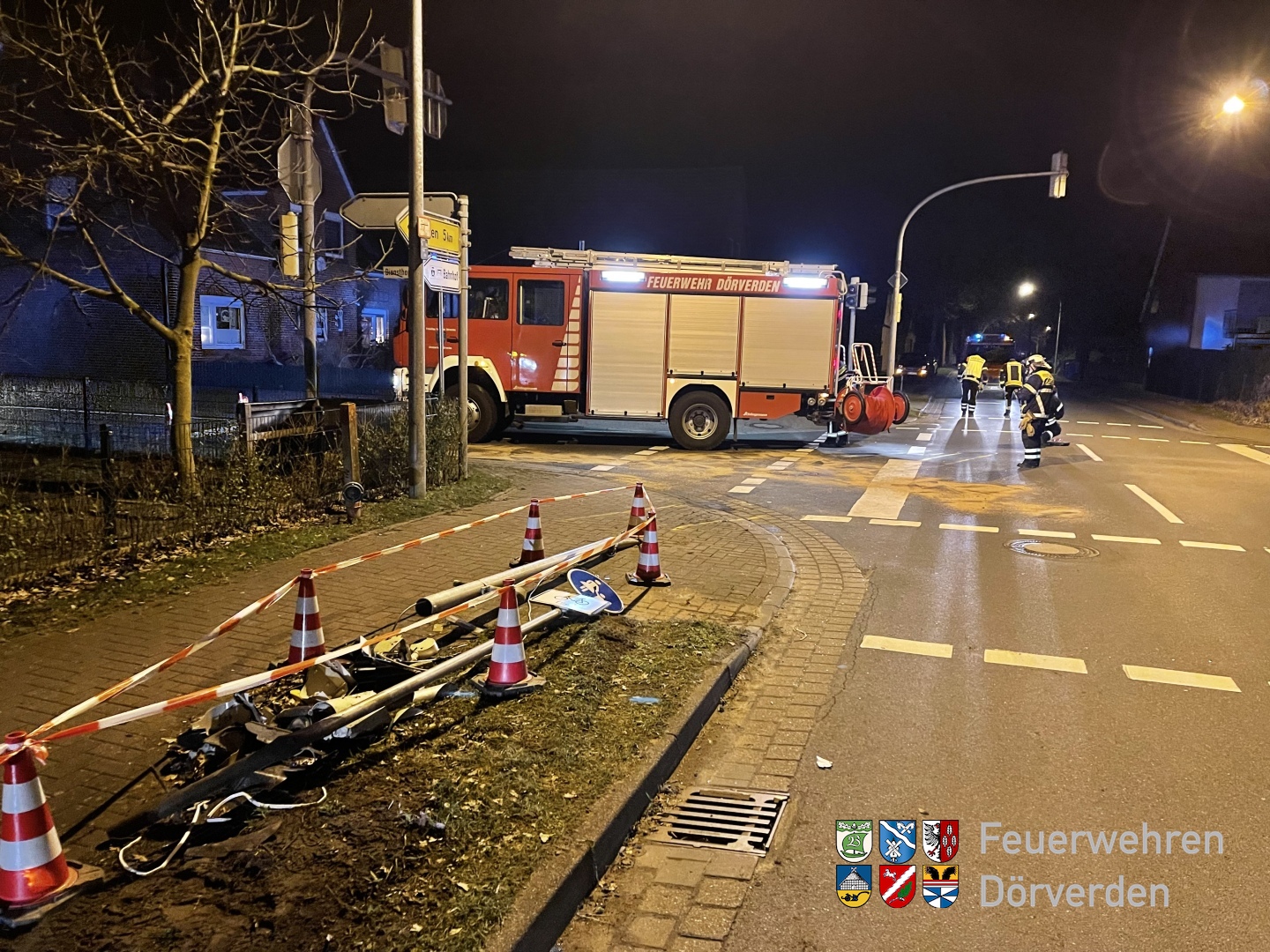 Kräfte der Ortsfeuerwehr Dörverden rückten am Sonntagabend in die Diensthoper Straße aus. Nach einem Verkehrsunfall in einem Kreuzungsbereich waren Betriebsstoffe u.a. Öl aus einem Unfallfahrzeug ausgetreten.
