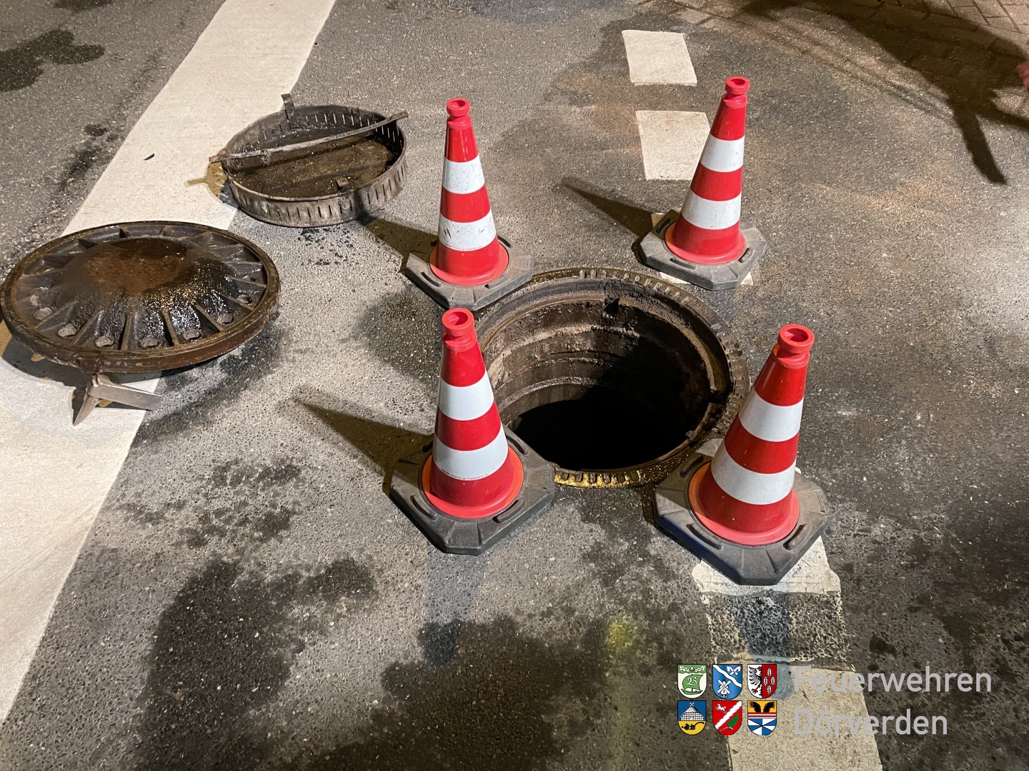 Die Feuerwehr sicherte einen Gully und reinigte die Fahrbahn. Der Verkehr wurde einseitig an der Einsatzstelle vorbeigeführt.