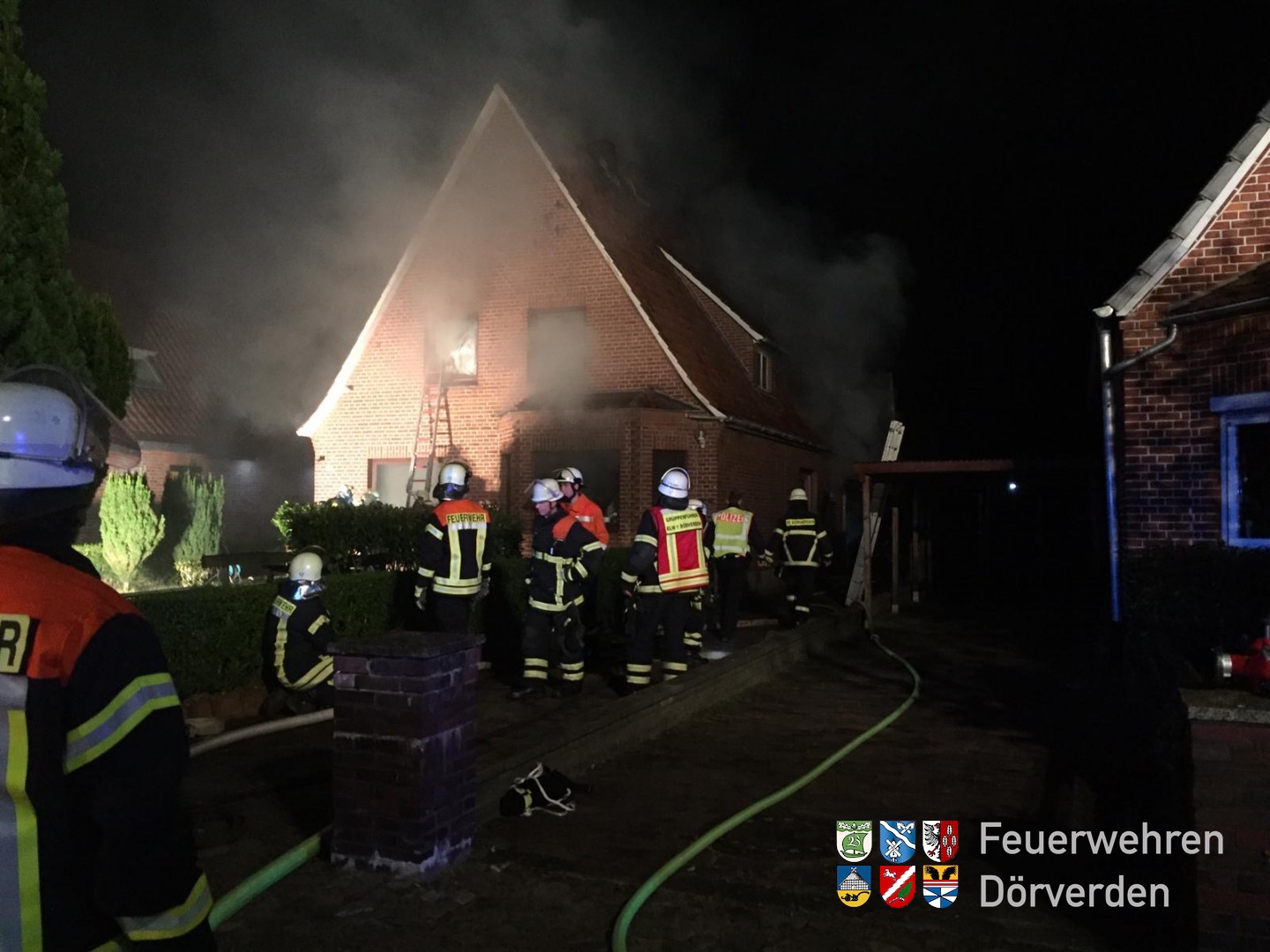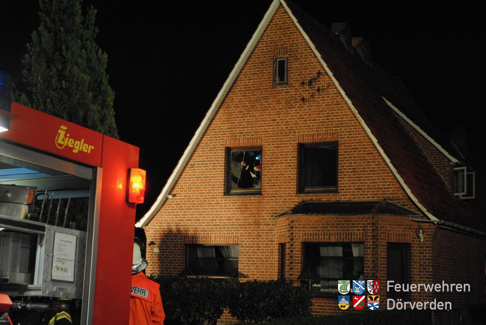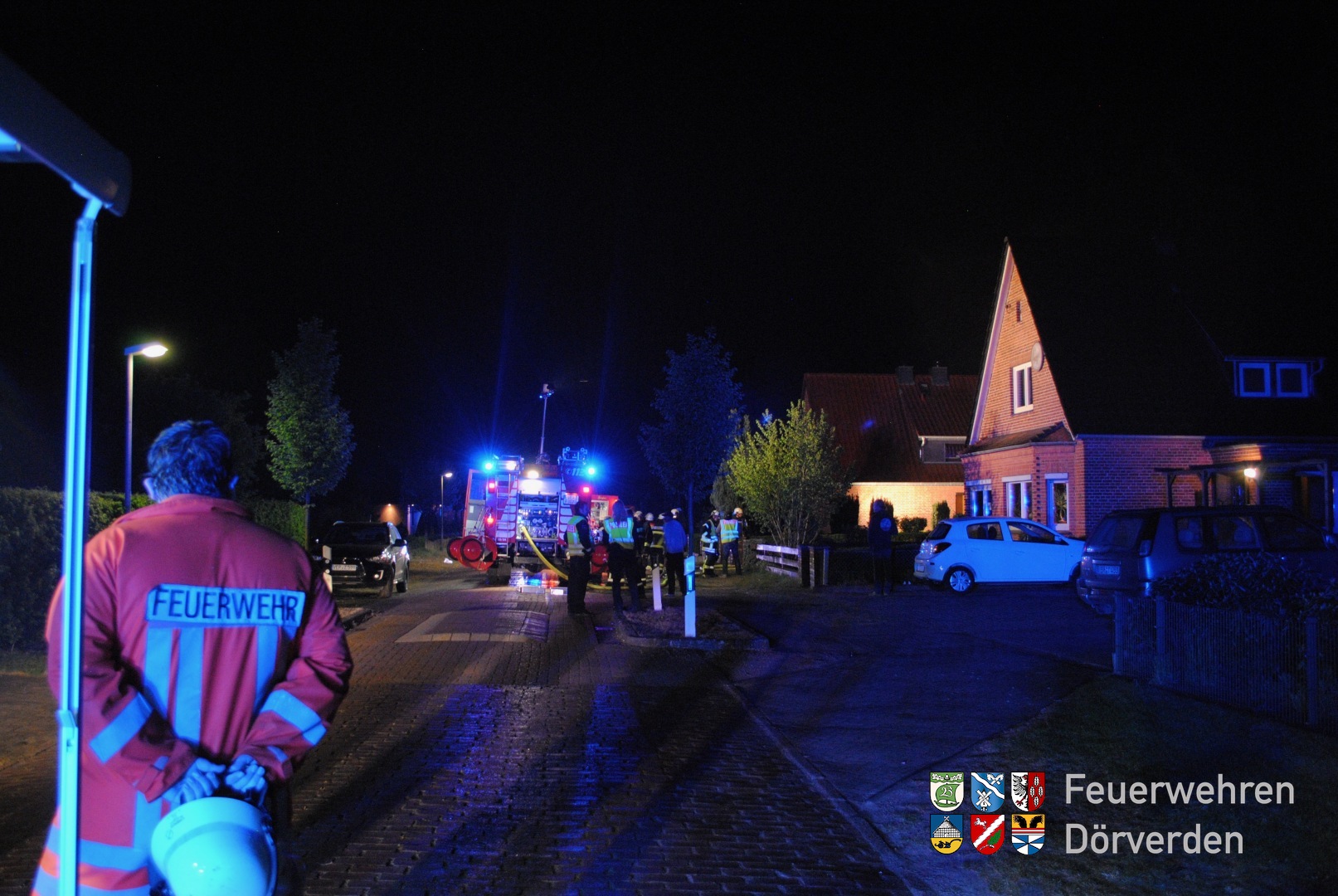 Kurz nach 22 Uhr kam es in der Stedorfer Bahnhofstraße zu einer Explosion in einem Einfamilienhaus. Beim eintreffen der ersten Einsatzkräfte schlugen Flammen aus dem Obergeschoss des Gebäudes. Drei Bewohner des Hauses wurden durch einen Ersthelfer der Feuerwehr versorgt und anschließend an den Rettungsdienst übergeben. Alle drei wurden sicherheitshalber zur weiteren Abklärung in ein Krankenhaus gebracht. Eine vierte Person galt erst als vermisst, dies bestätigte sich glücklicherweise nicht. Die Feuerwehr schickte zur Brandbekämpfung umgehen zwei Trupps unter Atemschutz in das Gebäude vor, diese verschafften sich durch das Treppenhaus, welches bereits in Flammen stand, Zugang zum Obergeschoss und dem Brandherd. Der Brand konnte durch das zügige Eingreifen der Feuerwehr schnell unter Kontrolle gebracht werden und somit eine Ausbreitung verhindert werden. Es waren rund 60 Einsatzkräfte von Feuerwehr, Rettungsdienst und Polizei im Einsatz.