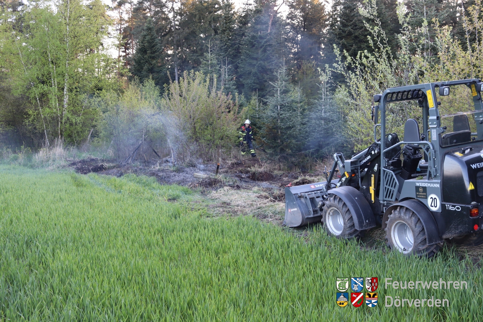 Am Sonntagabend kam es in der Ortschaft Diensthop nahe einer Baumschonung zu einem Flächenbrand. Ein Anwohner, der diesen aus der Ferne bemerkt hatte, eilte umgehend mit seinem Radlader zur Brandstelle, um diese auseinander zu fahren und so eine Brandausbreitung zu verhindern. Durch seinen Einsatz konnte Schlimmeres verhindert werden, die Aufgabe der Feuerwehr beschränkte sich lediglich auf die Nachlöscharbeiten und auf die Nachkontrolle mittels Wärmebildkamera. Die Polizei hat die Ermittlungen zur Brandursache aufgenommen.
