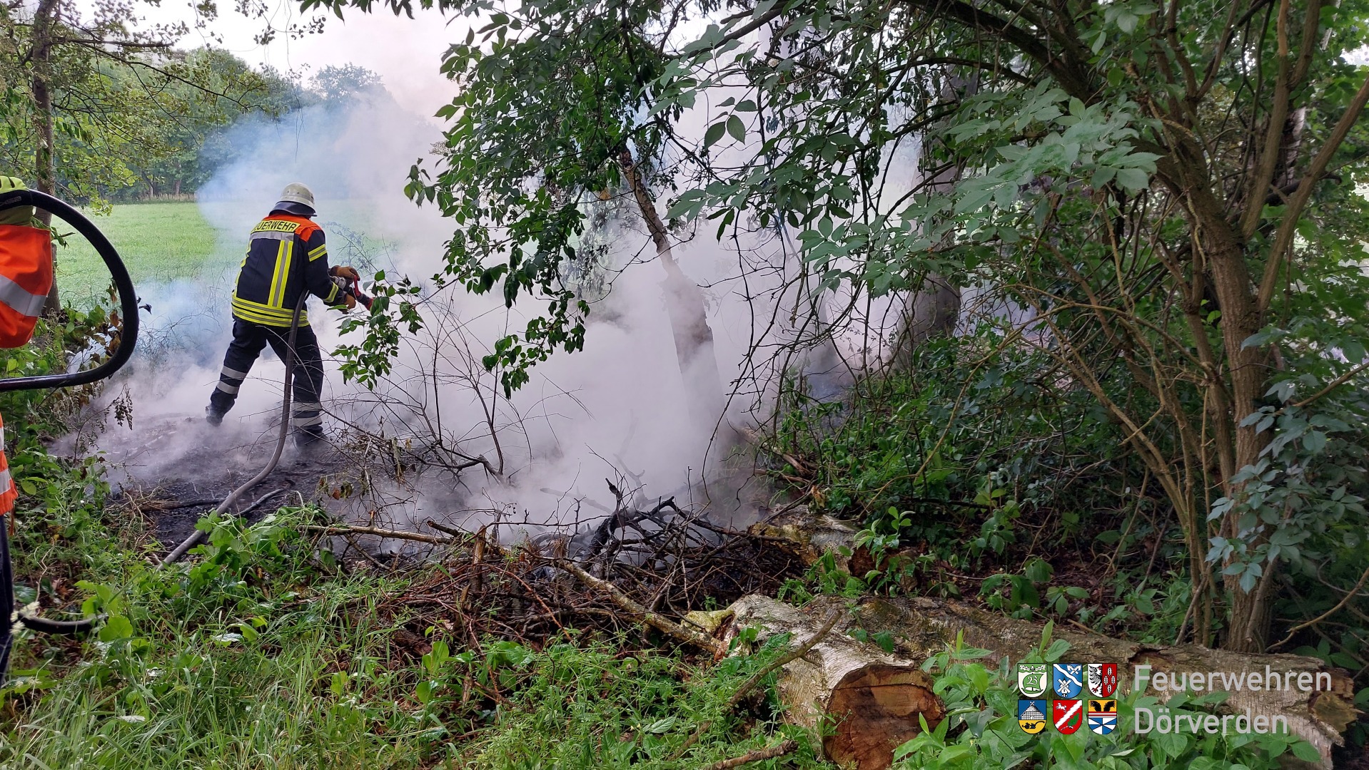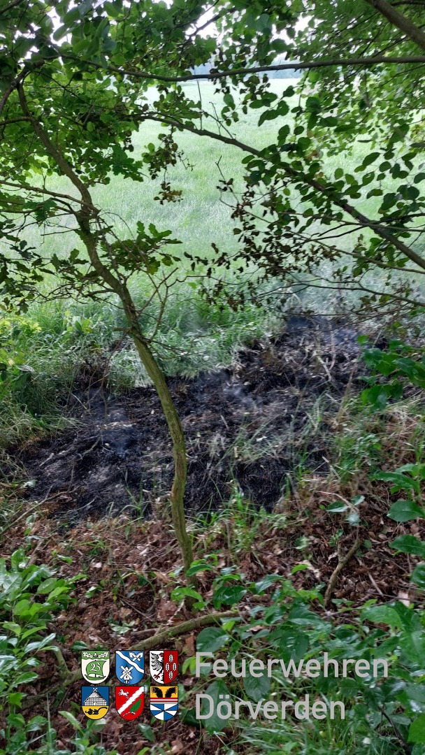Am frühen Donnerstag Abend wurden die Ortsfeuerwehren Hülsen und Westen zu einem Flächenbrand alarmiert. Nach einem kurzem Gewitterschauer wurde Unterholz und Gras unter einem Baum entzündet. Der Blitz schlug in den Baum ein und entfachte ein Feuer in dem trockenen Unterholz. Durch den Blitzeinschlag wurden mehrere kleine Brandnester am Wegesrand gefunden und abgelöscht. Da es eine Einsatzstelle an einem Feldweg mitten im Wald war, hatten wir Glück, dass sich ein Landwirt dort aufhielt und es sofort der Leitstelle meldete.