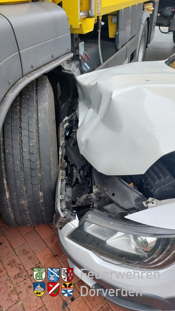 Am Donnerstag Nachmittag ereignete sich in der Ortschaft Barnstedt ein Verkehrsunfall. Ein LKW wollte abbiegen, dieses übersah ein PKW  und ist in diesen gefahren. Es wurden keine Personen verletzt. Das Abschleppunternehmen hat den PKW nicht vom LKW trennen können, da sich der PKW im LKW verkeilt hatte. Die Ortsfeuerwehr Westen wurde zusammen mit dem LF10 der Ortsfeuerwehr Hülsen alarmiert, um den PKW mit Hydraulischem Rettungsgerät freischneiden zu können. Im Anschluss wurde die Straße von den Trümmerteilen beseitigt und der Verkehr konnte wieder fließen.