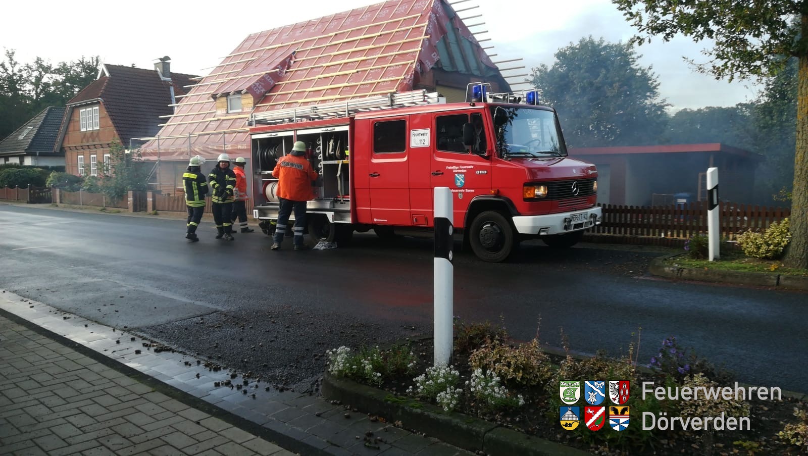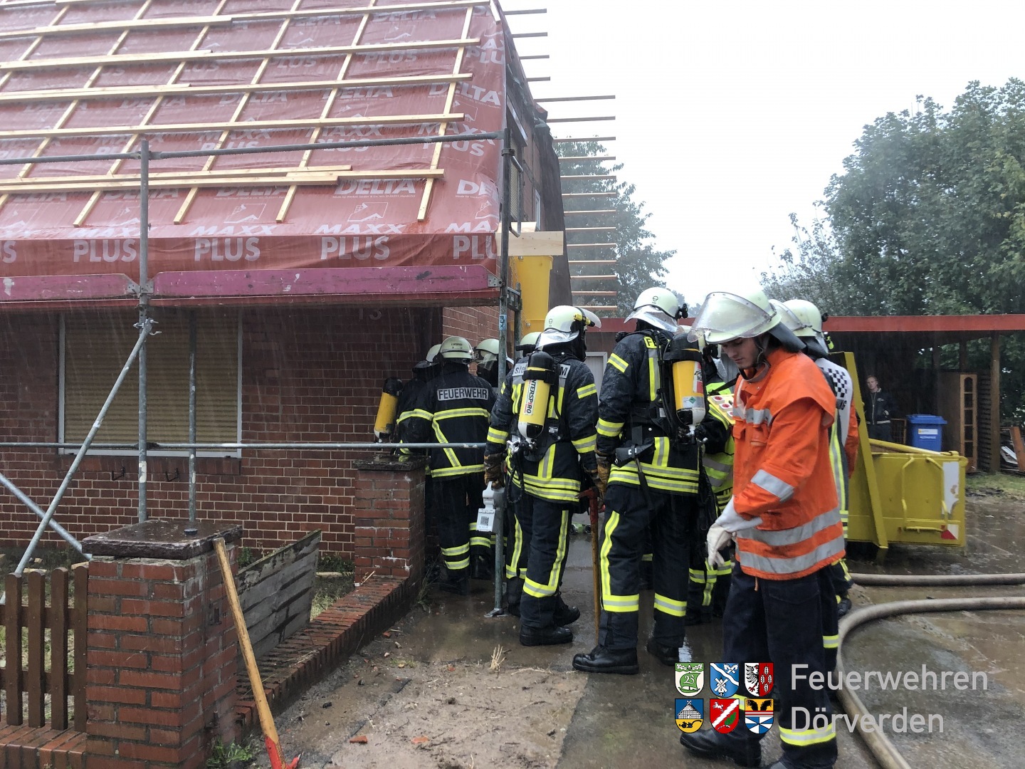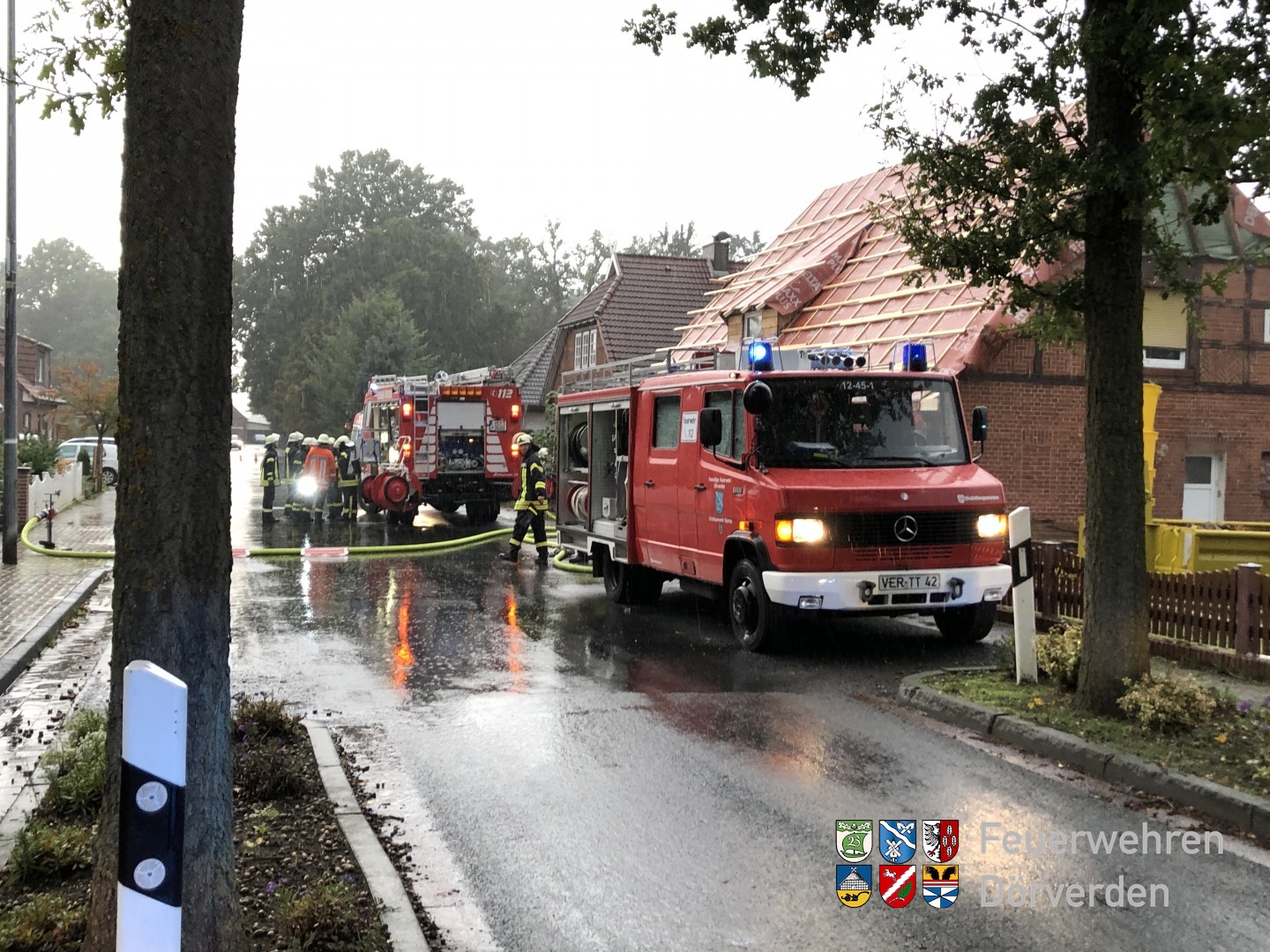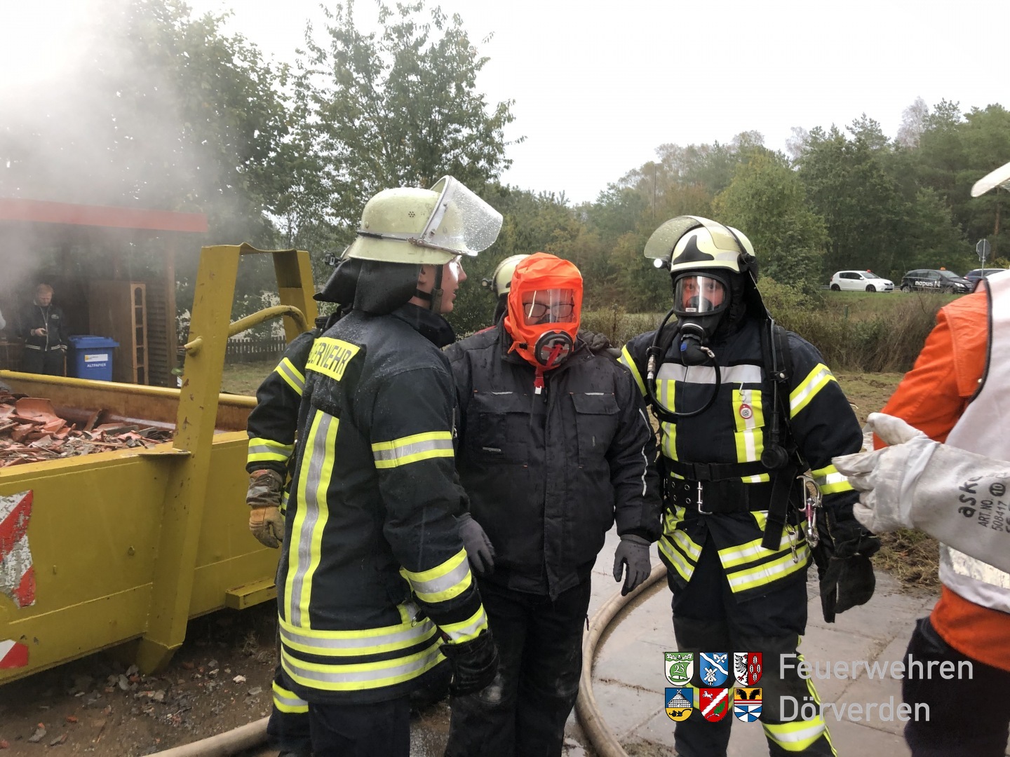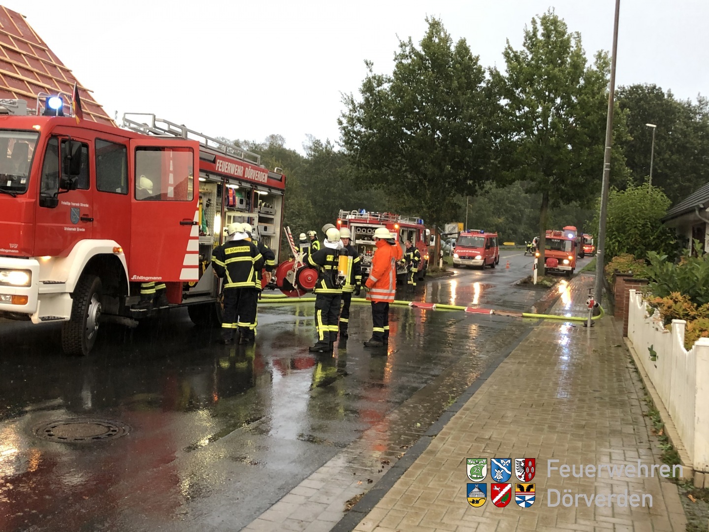 Die Feuerwehren Barme und Dörverden wurden gestern zu einer unklaren Rauchentwicklung in den Beckmannsweg nach Barme gerufen. Beim Eintreffen der ersten Einsatzkräfte stelle sich heraus, dass es bei Arbeiten an einer Heizungsanlage im Keller des Hauses zu einer starken Verpuffung kam. Drei Personen waren durch den starken Rauch im Gebäude eingeschlossen und mussten von Kameraden unter Atemschutz aus dem Gebäude befreit werden. Weitere Einsatzkräfte aus Stedorf wurden zur Unterstützung mit weiteren Atemschutzgeräteträgern nachalarmiert. Nach dem die Lösch- und Rettungsarbeiten abgeschlossen waren konnte die der Einsatz, der glücklicherweise nur eine Übung war, beendet werden. Dem Besitzer des Hauses gilt an dieser Stelle ein besonderer Dank, dass er sein Haus während der Umbauarbeiten für diese Übung zur Verfügung gestellt hat.
